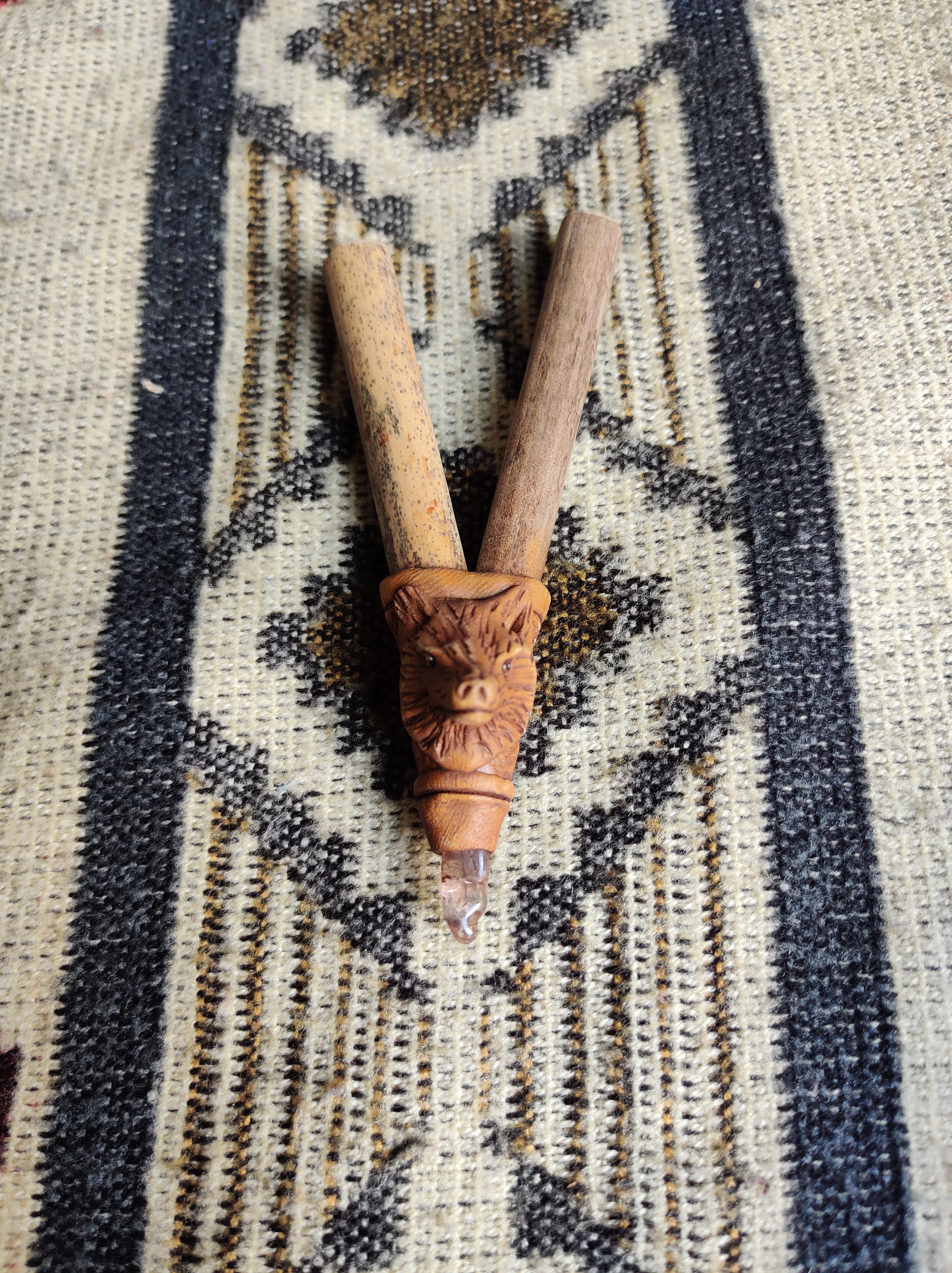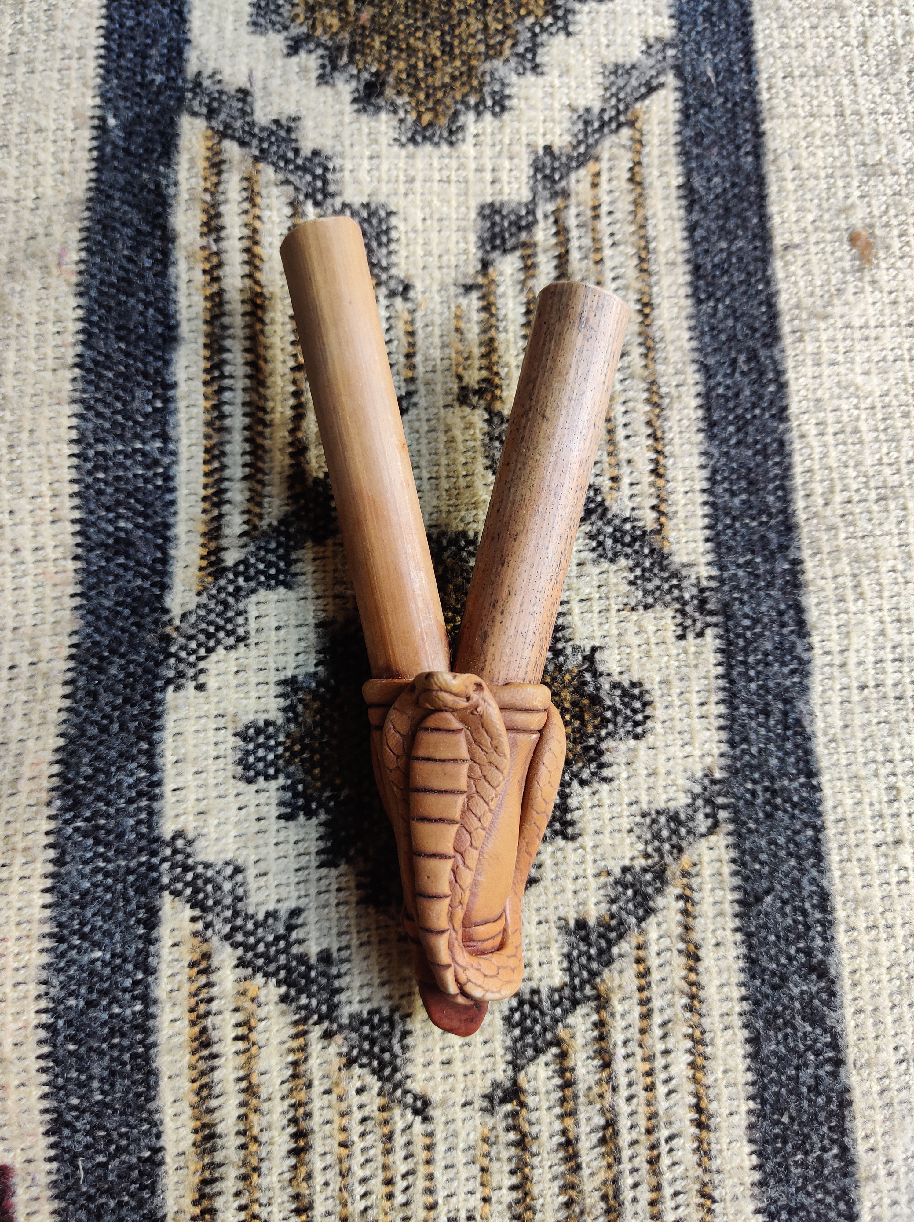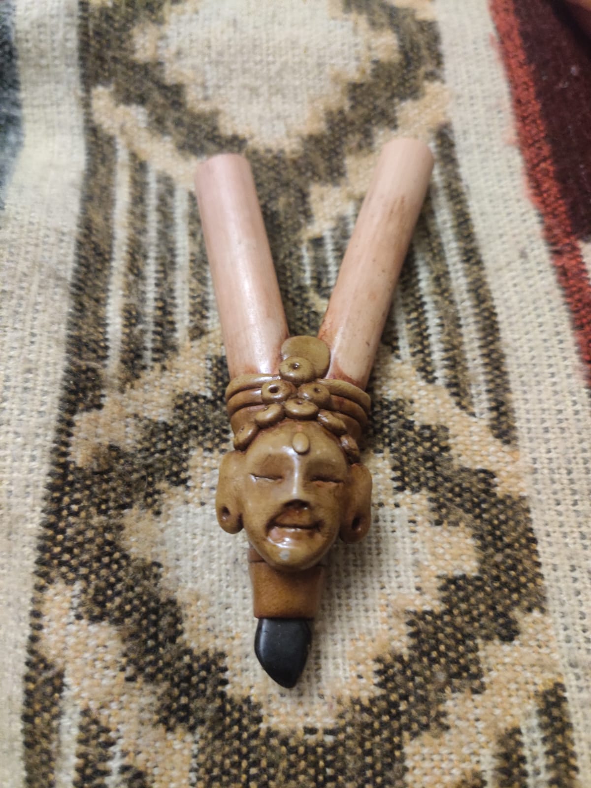 Kuripe pipes are self projectors that you can use to administer rapé to yourself. It’s a beautiful way of working with the spirit of rapé while also staying connected with your own energy. The pipe is made from bamboo, while the connection is made with beautiful clay figures that carry symbolic meaning to those who own them.